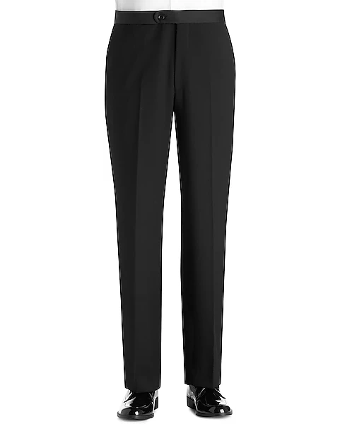 A grosgrain-faced lapel enhances the refined style of this all-black formalwear staple. Flat-front trousers feature a grosgrain stripe down the leg adding polish to the timeless look.