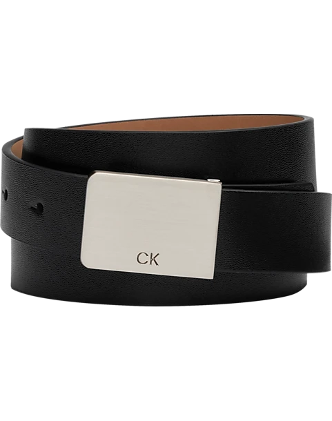 This slim Calvin Klein belt features a smooth plaque buckle embossed with the CK logo for a clean, modern finish to your look.