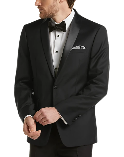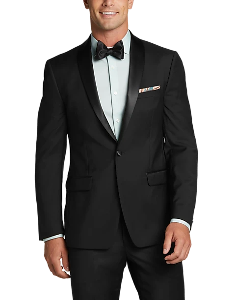This stylish tuxedo jacket is a modern standout from Calvin Klein. Tailored in fine 100% natural stretch wool, this jacket has a smooth satin shawl collar, satin-covered buttons and satin trim at the pockets.