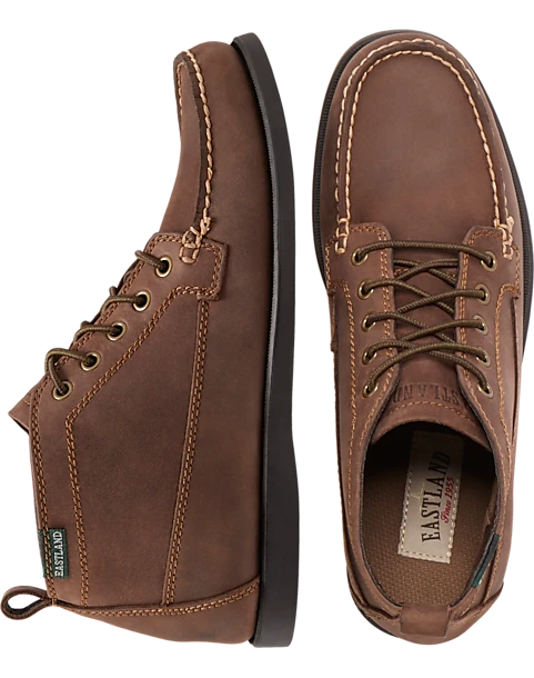 Step into the outdoors in style with these ruggedly handsome chukka boots by Eastland. Crafted from soft, easy-care leather, these classic ankle boots feature hand-sewn moccasin construction and the Eastland Exclusive Active Memory Foam comfort insoles that provide support as they conform to the contours of your feet. The shock absorbing, natural rubber outsole has traction, and ensures flexibility and comfort.