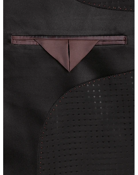 Create your own formal look with flair. This fine dinner jacket features a deep ruby red hue with a black floral pattern accented with a satin lapel and details throughout.