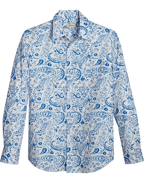 Vivid blue paisleys sweep across this woven cotton sport shirt, adding to its stylish good looks. The shirt is fashioned with a spread collar and a smooth placket.