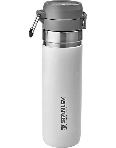Thanks to the leakproof design of the trigger-action lid, you can throw this 24 oz. bottle from Stanley into your backpack, gym bag or purse without worrying. The double-wall insulation keeps hot beverages hot for up to 8 hours and cold beverages cold for up to 12 hours. A push button on the lid opens the mouthpiece on the top, and it can fit most car cup holders. Dimensions 3.0L x 3.0W x 10.9H in.