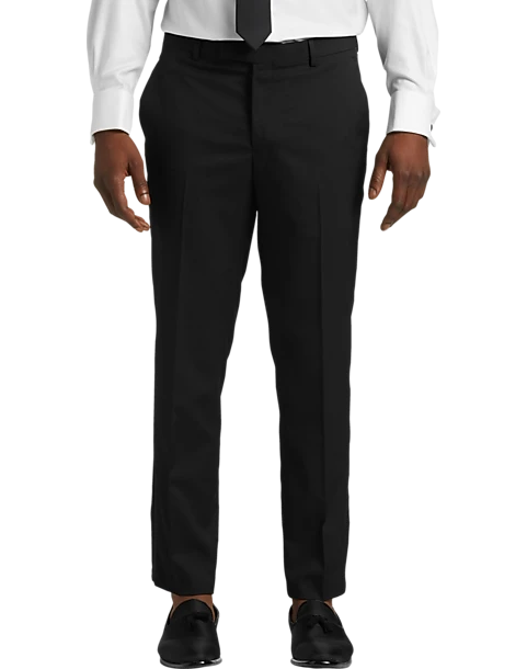 - 87% polyester 11% rayon 2% spandex|Two-button jacket|Shawl lapel|Side vents|Flat-front slacks|Finished hem